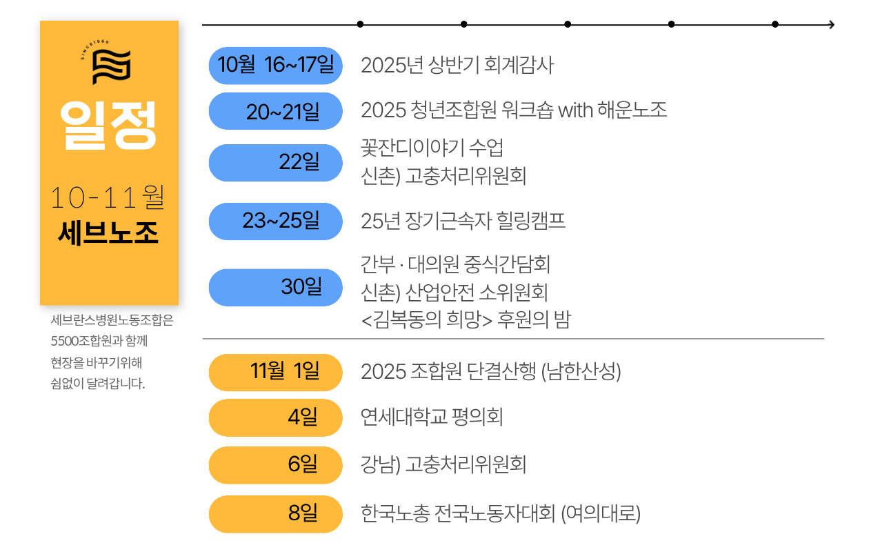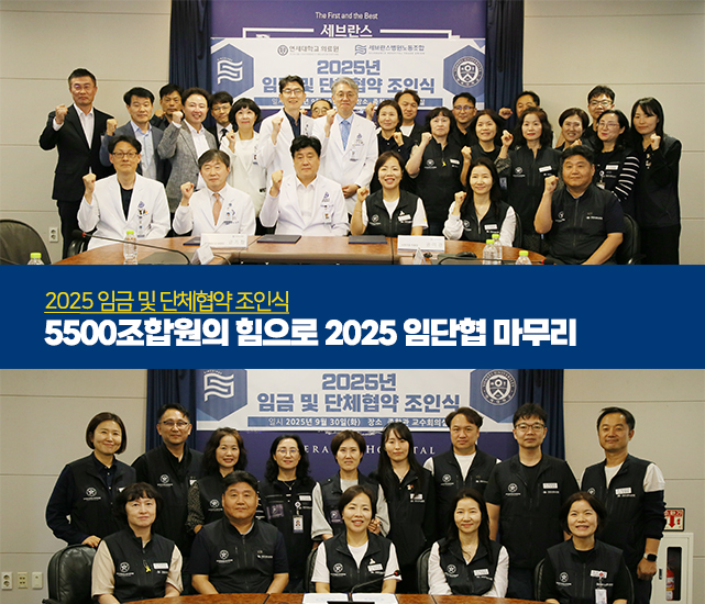 5500 조합원의 힘이 모여 2025 임금 및 단체교섭을 무사히 마무리할 수 있었다. 그동안 보내주신 힘찬 지지에 진심으로 감사의 마음을 전한다. 앞으로도 세브란스병원노동조합은 현장의 목소리에 귀기울이며 책임 있는 자세와 진정성 있는 실천으로 조합원과 함께 할 예정이다.