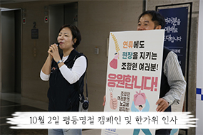 [보고] 10월 2일(목), 노동조합은 신촌 종합관 식당/제중관 식당 앞에서 오란다 간식을, 강남에서는 전 부서에 기정떡을 나누며 명절 인사와 평등명절 캠페인을 진행했다.