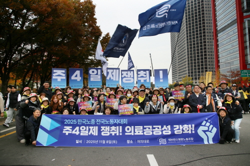 지난 11월 8일(토) 여의대로에서 열린 2025 한국노총 전국노동자대회에 우리 노동조합도 함께 투쟁했다. 전태일 열사 55주기를 맞아 열린 이번 노동자대회에서 한국노총은 '주4.5일제 도입, 노동기본권 확대' 등을 강력히 요구했다. 우리 노동조합은 조합원 70여 명과 함께 <주4일제 쟁취! 의료공공성 강화!>를 외쳤다.