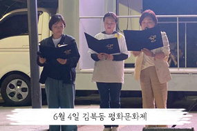 [보고] 2025 인권평화운동가 김복동 평화주간을 맞아 열린 김복동평화문화제가 6월 4일 저녁 진행됐다. 노동조합 역시 문화제에 참석해 평화와 인권의 가치를 되새겼다. 최근 이스라엘-이란의 전쟁으로 국제정세가 요동치는 요즘, 전쟁으로 일상이 파괴된 이들의 아픔을 다시금 생각할 계기가 되고 있다.
